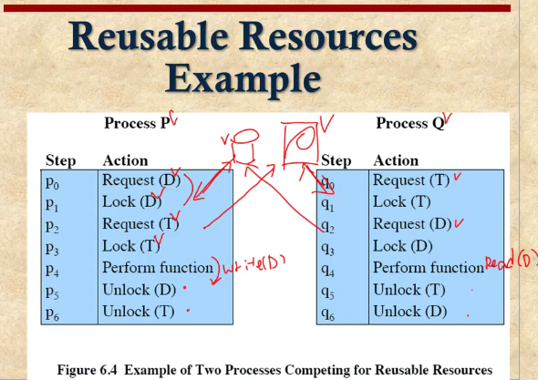 재사용 가능한 리소스 - 공유할수 없고 한번에 하나의 프로세스만 쓸수 있는 프로세서, IO, 메인메모리, 각종 디바이스, 통신장치, 세마포어 ...